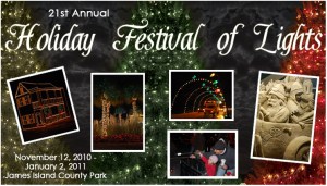 To help spread a little Christmas cheer Moonlighting encourages all Charleston and lowcountry residents to visit the James Island County Park’s 21st Annual Festival of Lights! The Festival of Lights has over 600 individual holiday lighting displays containing more than 500,000 lights! This event attracts more than 200,00 visitors a year! Marking it 7th on the countries top ten holiday lights show according to Americas Best & Top 10 Discounts are also available to visitors by donating any canned goods! Don’t miss this wonderful holiday display available to spectators November 12th 2010 until January 2nd 2011.